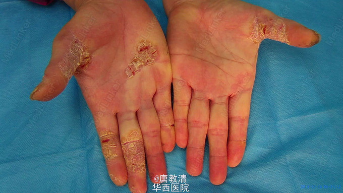 患者女, 手掌、跖不、肘部角化并皲裂2年,疼痛,稍痒 患者长期在鞋厂工作 皮损不具典型性和特殊性,考虑: 1.慢性接触性皮炎?2.皲裂性湿疹?3.寻常型银屑病? 不知大家看法如何?