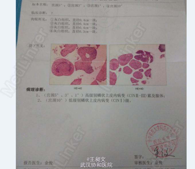 妇检:外阴已婚型,阴道畅,宫颈中度糜烂,子宫常大,附件未及明显异常。 2015年4月25日 LCT提示HSIL,HPV-DNA提示:HPV59 (+)。 2015年5月20日门诊宫颈活检提示CINⅡ-Ⅲ级累及腺体。