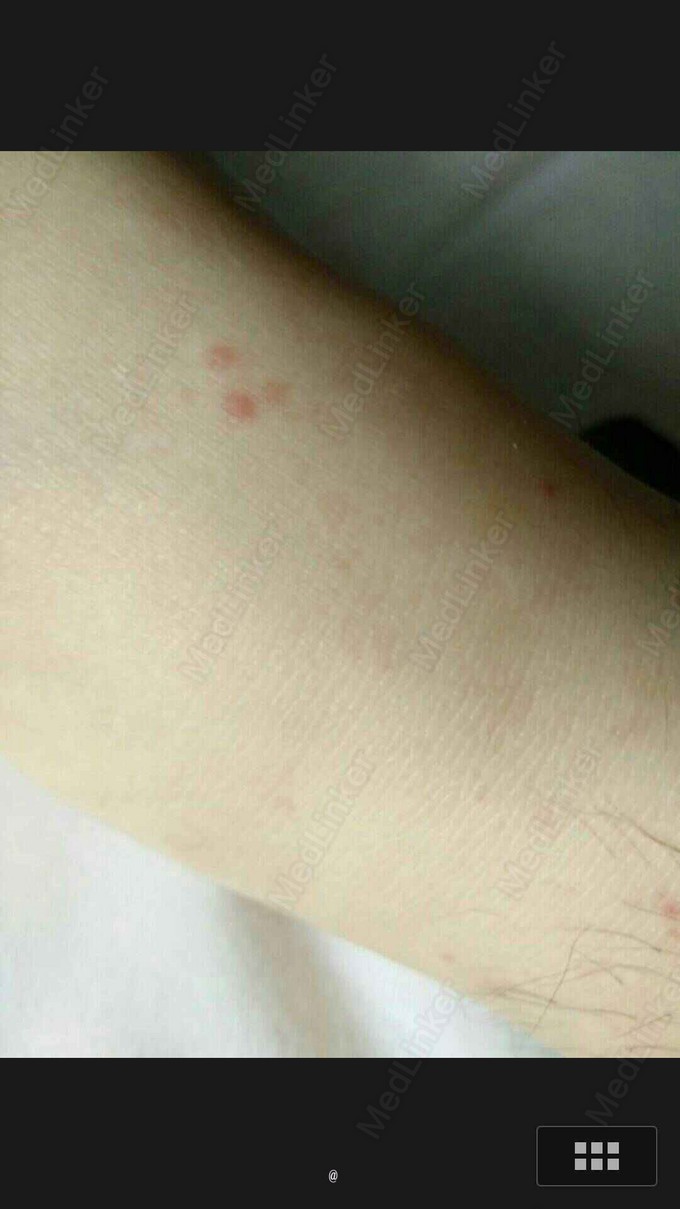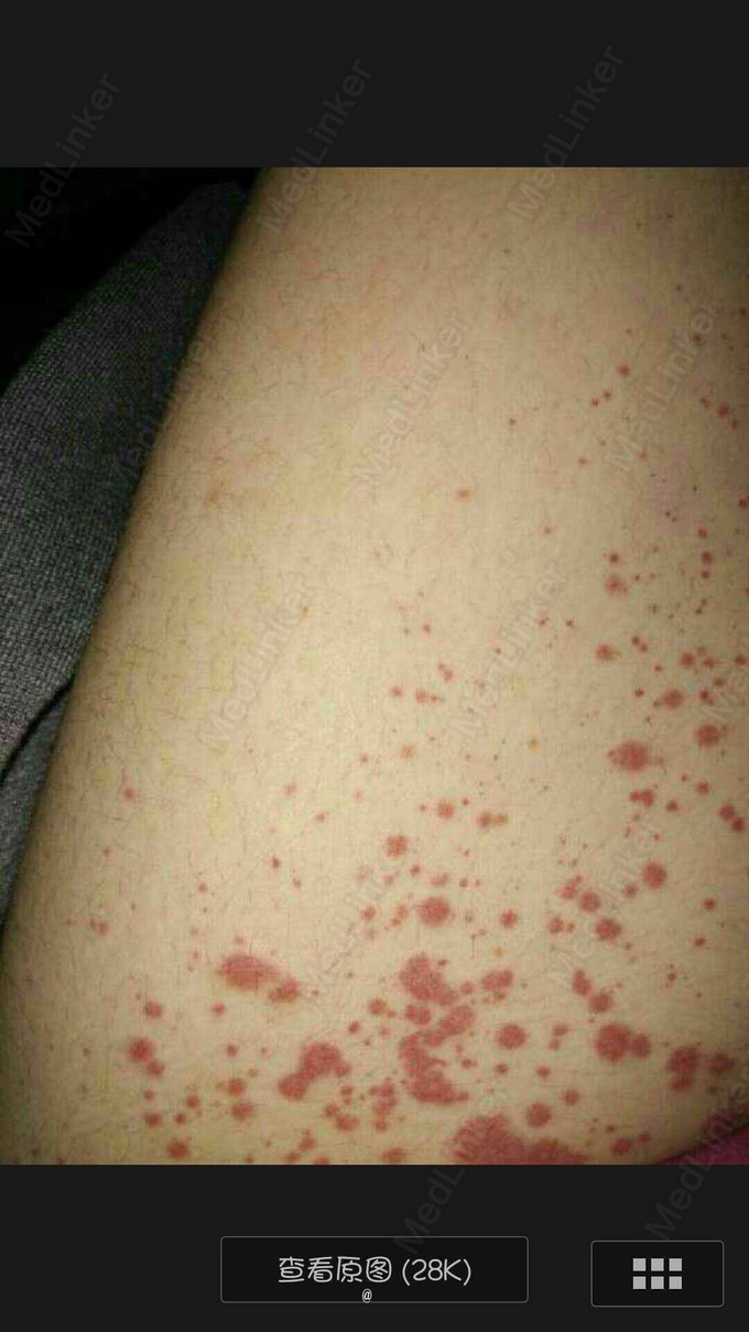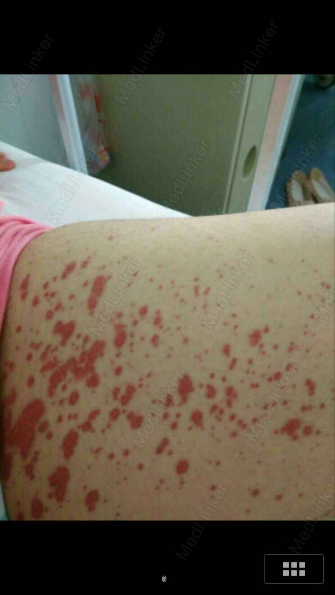 患者,女,16岁 主诉:双下肢紫癜两天 病史:患者于5天前因“感冒”自行口服“抗感冒药”(具体不详)后出现下腹腹痛,呈绞痛性,伴踝关节疼痛,不伴恶心呕吐、便血等症状,大便后稍缓解,至当地医院门诊就诊,诊断为“胃肠炎”并予以对症治疗(具体不详)。患者腹痛好转,两天前于大腿根部出现散在红色皮疹,不伴瘙痒,后逐渐增多变紫并融合成片,为求进一步治疗至我院就诊,门诊以“过敏性紫癜”收入院。起病以来,大小便正常,精神体力可,体重无明显变化。 既往无特殊
