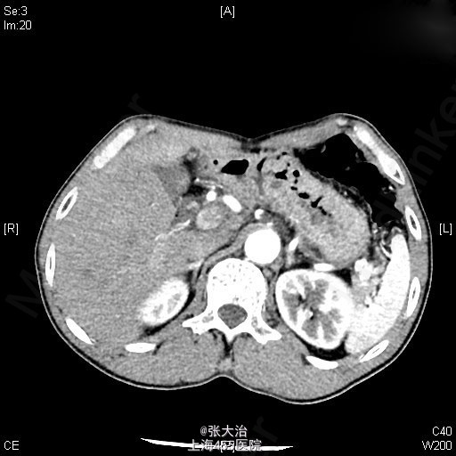 查体:神志清晰,精神尚可,呼吸平稳,营养中等,表情自如,发育正常,自主体位,应答流畅,查体合作。全身皮肤无黄染,无肝掌、蜘蛛痣。全身浅表淋巴结无肿大,无明显贫血貌,左锁骨上淋巴结(-);腹部平坦,未见肠型或胃蠕动波,未见腹壁静脉曲张;全腹软,无压痛、反跳痛、肌紧张。肝脾肋下未及,包块未及;移动性浊音(-),肠鸣音正常,每分钟约3次,不伴高调音、气过水声。 2014-4-10某人民医院就B超(92301):肝囊肿,左肝内胆管扩张;MRI(1697647):肝门区病变可能伴左肝内胆管扩张。 2014-4-22某人民医院MRCP(68941):肝门处占位伴肝内胆管扩张,考虑胆管细胞癌可能大,肝多发囊肿。 肝动脉CTA、门脉CTV、肝静脉CTV、下腔静脉CTVCT【2014-05-05 我院】 :肝门区MT,肝左、右动脉及门脉主干、左支受侵;肝及双肾小囊肿。 上腹部平扫+增强+DWI+MRCPMRI【2014-05-06 我院】 :肝左叶MT(胆管细胞型机会大)伴肝左叶胆管扩张,门脉受侵;肝、双肾小囊肿。 肝脾及门脉;胆(含胆总管);肾+输尿管;胰超声【2014-05-05 我院】 :超声造影:肝门部偏左侧实质占位--考虑肝门部胆管MT,侵犯门脉左支可能;肝左叶胆管扩张;右肾囊肿 肝脏超声造影超声【2014-05-05 我院】 :超声造影:肝门部偏左侧实质占位--考虑肝门部胆管MT,侵犯门脉左支可能;肝左叶胆管扩张;右肾囊肿 肝脏术后(检查胸水、腹水、手术区、膈下)超声【2014-05-20 我院】 :右侧胸腔少量积液;腹水