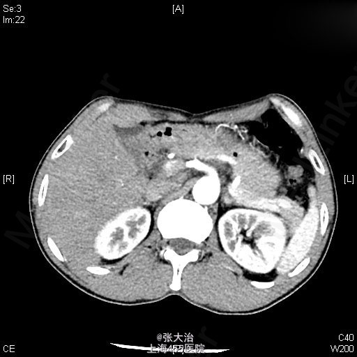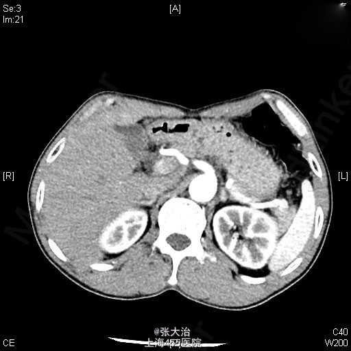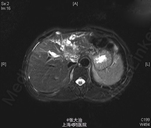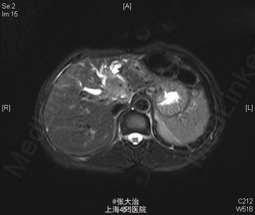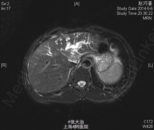 主诉:腹痛伴后背胀痛4月余 现病史:患者4月前无明显诱因下出现腹部隐痛,伴后背胀痛,无恶心、呕吐,无发热、畏寒,无腹泻。2014-4-10至句容市人民医院就诊,B超示肝囊肿,左肝内胆管扩张;MRI示肝门区病变可能伴左肝内胆管扩张。2014-4-22至江苏省人民医院,查CA199 239.7U/ml,CEA 18ng/ml,MRCP示肝门处占位伴肝内胆管扩张,考虑胆管细胞癌可能大,肝多发囊肿。现为进一步诊治收入我院。 患者自发病以来,精神可,胃纳可,二便无殊,体重无明显改变。