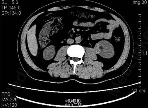 3、既往病史:高血压,高尿酸,高血脂6年,2013年行“右输尿管结石碎石取石术” 4、入院查体:未见明显异常体征。 5、影像学检查:中下腹部CT平扫+增强+CTU:左肾中盏可见结节状高密度影,直径约为6mm,基本同前。左肾下部可见大小约为36×21×23mm稍高密度影突出于包膜生长,较前明显增大,凸向肾外生长,浅分叶,其内见脂肪密度影,增强扫描可见轻度强化,病灶与左侧腰大肌关系密切。