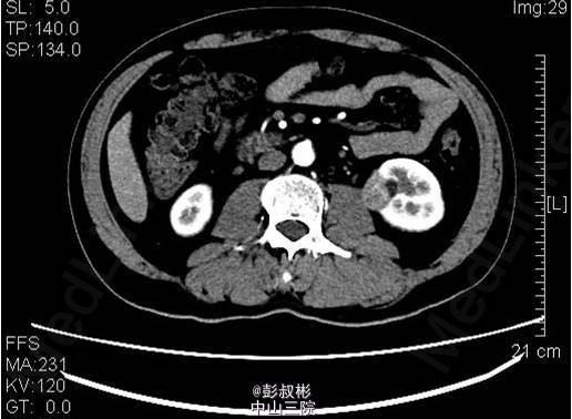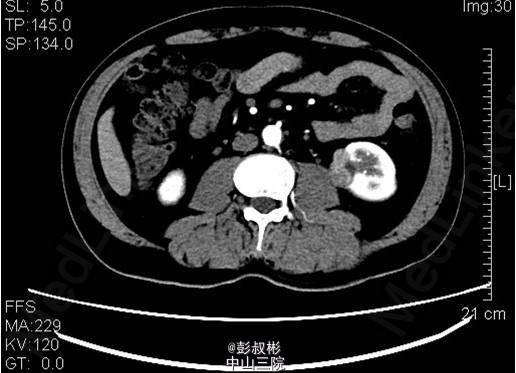 1、患者,男,52岁,因“发现左肾肿物3年余”入院 2、现病史:患者3年余前体检发现左肾一肿物,去年我院住院CTU检查考虑为“肾错构瘤”,未特殊处理,嘱其定期复查。今患者来诊,复查B超发现该肿物明显增大,考虑肾癌可能,为进一步诊治收住我科。