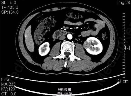 8、患者术后恢复可,顺利出院。 9、40多年来,对采用经典根治性肾切术治疗肾癌的观念巳经发生了部分变化,特别是对手术切除范围的变化(如选择适当病例实施保留同侧肾上腺根治性肾切除术、保留肾单位手术)已经达成共识,治疗方式也不再是单一的开放性手术,还包括如腹腔镜手术、机器人腹腔镜手术、单孔腹腔镜子术及小切口腹腔镜辅助手术等。开放性及腹腔镜根治性肾切除术两种手术方式的治疗效果无明显区别。 国外进行的一项前瞻性三期临床随机对照研究报道,局限性肾癌患者,行根治性肾切除术与根治性肾切除+区域淋巴结清扫术的患者在并发症发生率、总生存期、疾病进展时间、元疾病进展生存期方面均无明显差别。因为没有明确证据显示肾癌患者行区域或广泛性淋巴结切除术能提高患者的总生存时间,因此,不推荐对局限性肾癌患者行区域或扩大淋巴结清扫术。但是,若术中可触及到明显增大的淋巴结或CT 扫描发现增大淋巴结时,为了明确病理分期可行肿大淋巴结切除术