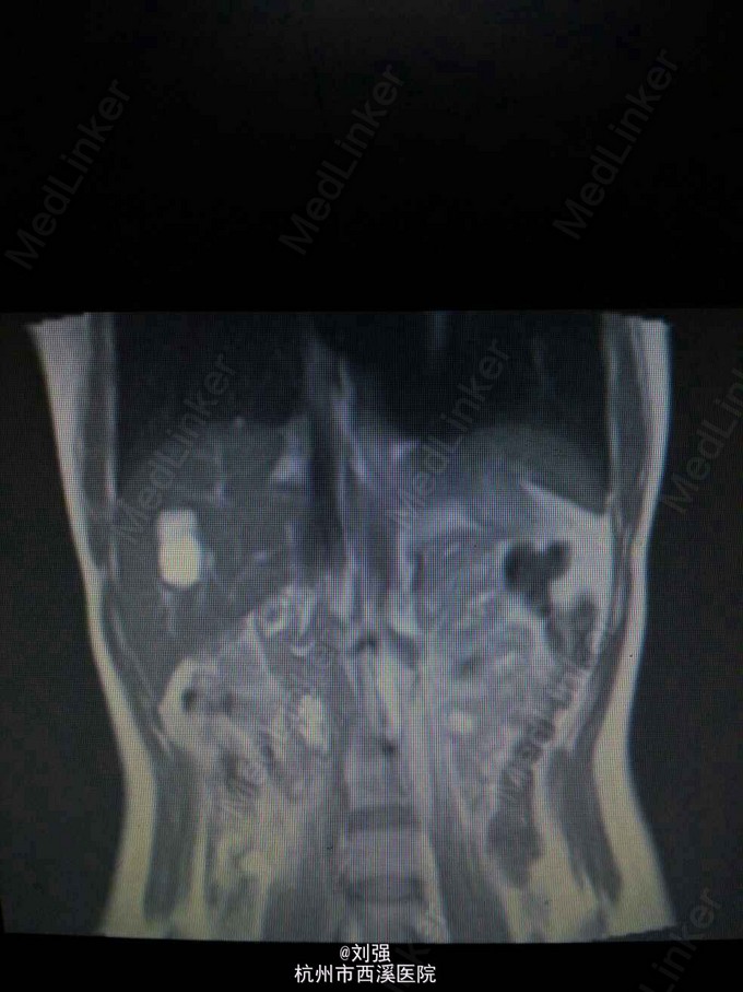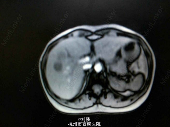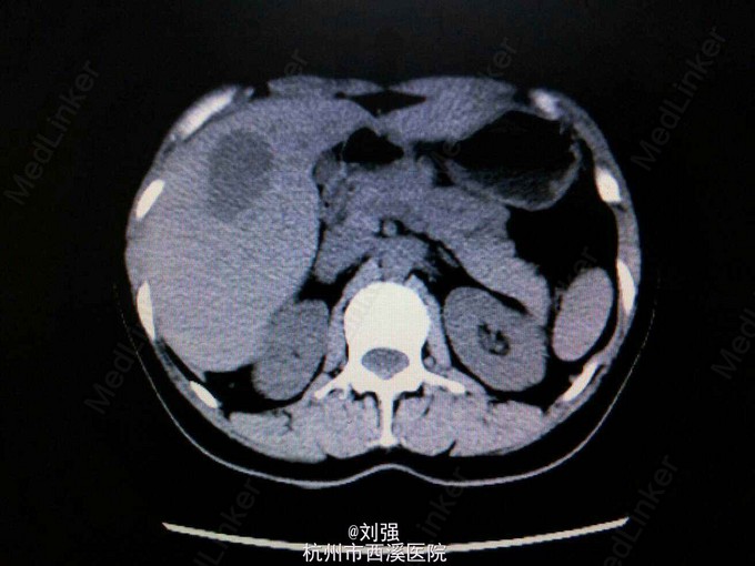 患者40岁女性,因“肝区疼痛2月余,加重10余天”入院。1个月前到外院就诊,腹部CT提示肝S5血管瘤。既往有"胃溃疡"病史。余病史无特殊。