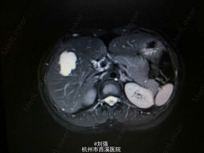 查体:生命体征平稳,心肺无特殊。腹部外形正常,腹式呼吸存在,无压痛以及反跳痛,肝区叩击痛阳性。辅助检查:实验室检查提示白蛋白下35.97g/L。腹部彩超提示:肝S5一大小为4.3cmX3.5cm实质性病灶,考虑血管瘤。腹部MRI检查提示S5段血管瘤。