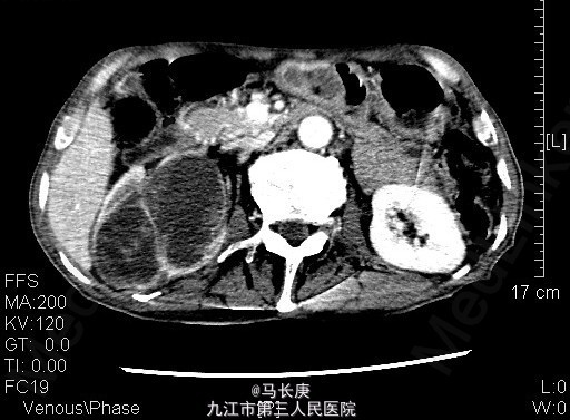 5、考虑右肾盂癌 6、入院后给予双肾核素扫描、CTU检查,考虑右肾盂癌,给予抗炎、补液、治疗。现病情平稳。 术前诊断:右肾盂癌、胆囊炎、左肾囊肿、右侧输尿管结石、贫血、低蛋白血症、胆囊炎,后行右肾癌根治术,手术顺利,术后恢复较好,术后病理示:肾恶性肿瘤(高分化肉瘤)。