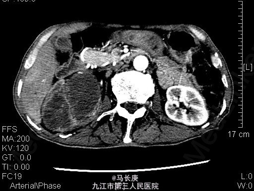 1、右上腹痛伴全程肉眼淡红血尿2月 2、患者于2月前无诱因出现右上腹痛伴全程肉眼淡红血尿,可以自行缓解,无血块、血条,无尿频、尿急、尿痛,无排尿困难,当时未引起重视,未去就医,7天前右上腹痛及血尿加重,于当地人民医院就诊,诊断为:右肾占位,现为进一步诊治于来我科进一步治疗。起病以来,一般情况尚可,近期体重明显下降。