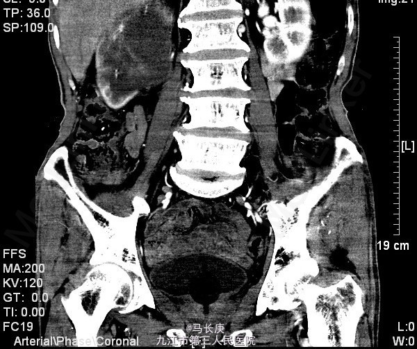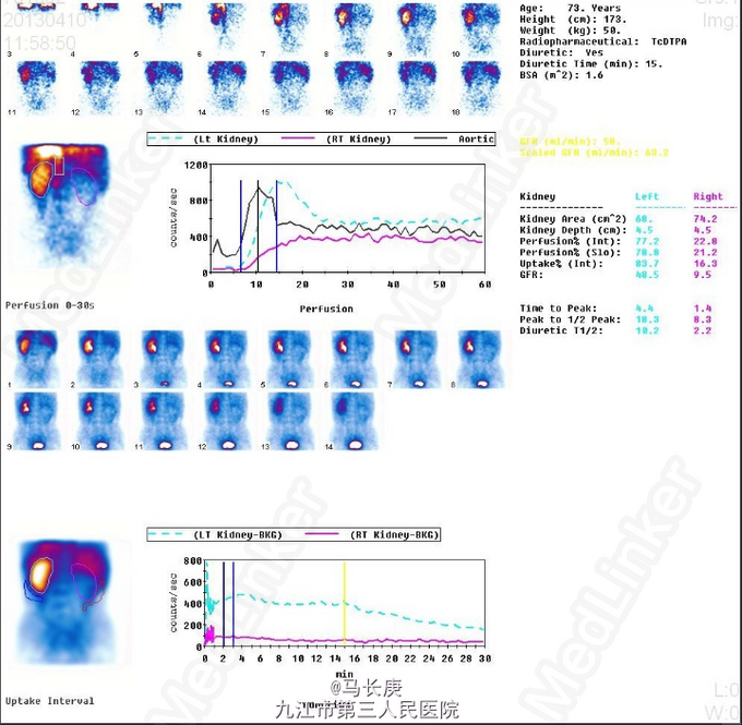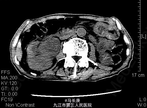 3、查体:无明显异常 4、辅助检查:当地人民医院泌尿系CT平扫+增强:1.右侧输尿管结石2.右肾占位?(未见报告),我科fish(+)CTU:肾盂癌,侵蚀右肾包膜,左肾囊肿,慢性胆囊炎。双肾核素扫描:右肾GFR:9.5,左肾48.5