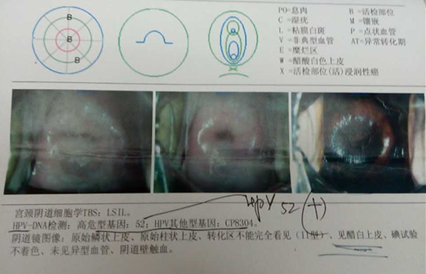 主诉:发现宫颈病变2月余。现病史:女 50岁 G1P1A0 平素月经规则,周期30-35天,经期5-7天,经量中等,色暗红,无痛经。 2015-07-14因外阴瘙痒在当地妇幼保健院就诊,查TCT:LSIL(CIN1),HPV高危型检测52型阳性。07-20在该院阴道镜下宫颈活检,病理回报LSIL,见凹空细胞。并送我院会诊病理回报:切片1:宫颈病变符合CINI-Ⅱ,切片2宫颈病变符合CINⅡ-CINⅢ。我院查生殖道分泌物检查正常。平素无伴同房出血,体重无明显变化。