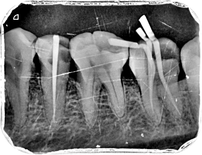 诊断:35,37牙髓炎 治疗:经患者知情同意后,35,37局麻去腐降牙合,开髓拔髓寻找根管口,建立直线通路,扩通根管,确定工作长度。S3/EDTA凝胶镍钛器械,低浓度次氯酸钠冲洗根管,预备至25/06,试主尖X线示恰充,试干根管,导AH-PLUS糊剂,VDW热压胶垂直加压根充,术后见根管恰充,暂封观察进行桩冠修复,对患者进行牙周治疗,口腔宣教。