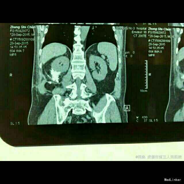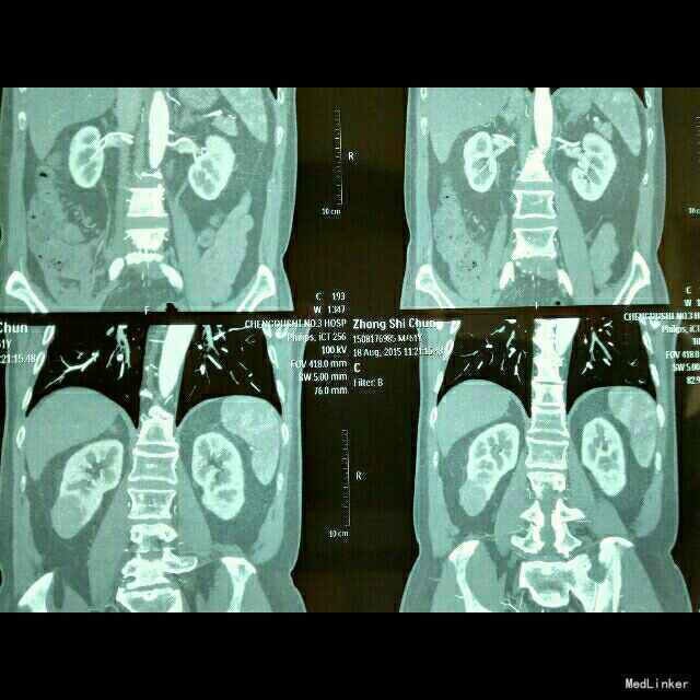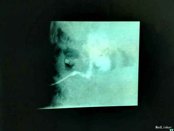 双肾区无扣痛,引流液细菌培养阴性。窦道造影见图片。