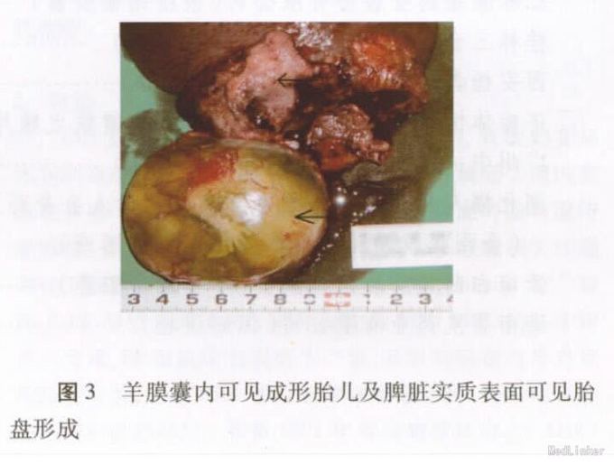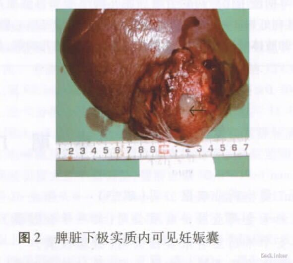 入院诊断:脾脏异位妊娠(孕周约14周); 腹腔内出血。给予输注2单位RBC以纠正贫血症状。入院后第2天全麻下行脾脏切除术。术中于脾脏下极实质内可见一直径约6cm的妊娠囊(羊水清亮,胎儿形成,胎儿身长约11cm,可见胎动,胎盘面积约15cm2) ,脾脏被膜有凝血块,该处已与腹壁粘连,被大网膜包裹,无明显活动性出血,术中探查见肝、胆、胰腺未见异常,子宫及双侧附件区未见明显异常。术中诊断:脾脏妊娠并脾脏破裂出血。因有胎盘形成,最终行脾切除术+包裹脾下极的部分大网膜切除术。术后病理示:( 脾脏) 异位妊娠,见胎儿形成,大网膜组织内出血伴凝块形成。术后给予抗生素联合应用预防感染,术后第7天血β-HCG 370. 7IU/L,尿HCG45IU/L,血HGB93g/L。患者术后第8 天痊愈出院。