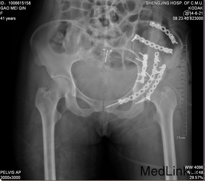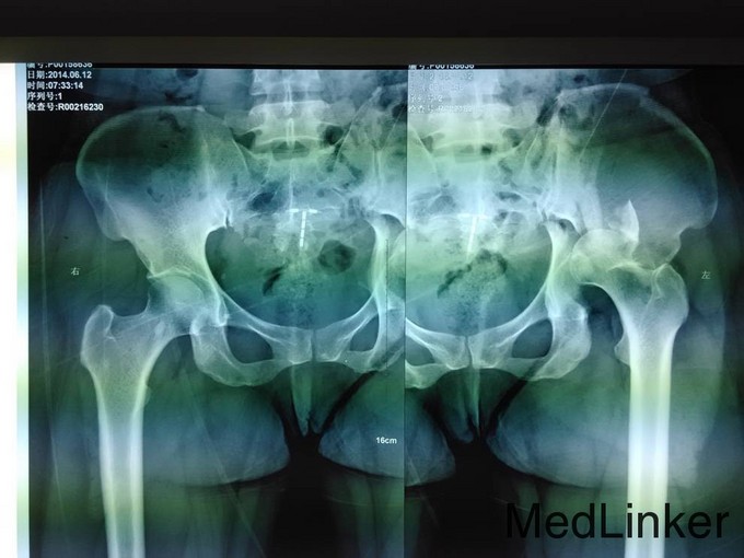 患者左髋臼骨折,髋臼骨折出血量大,应用自体血回输继续。术中注意血管及神经的副损伤。