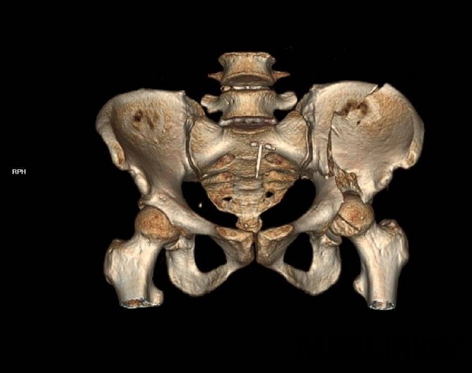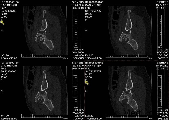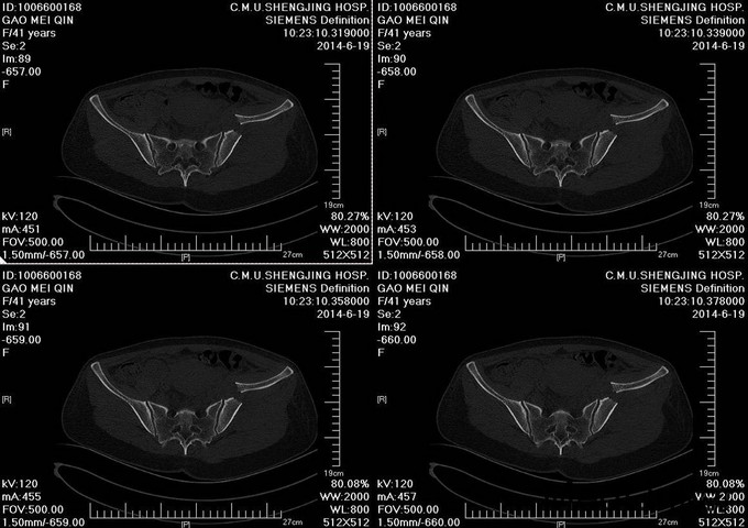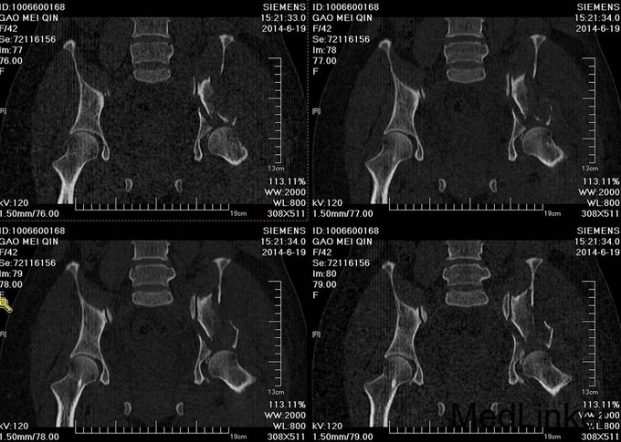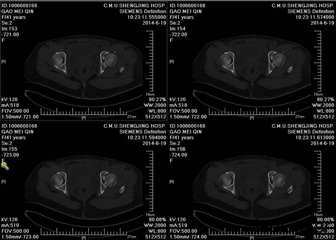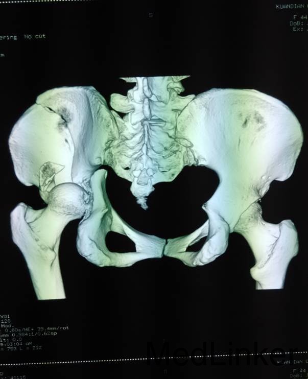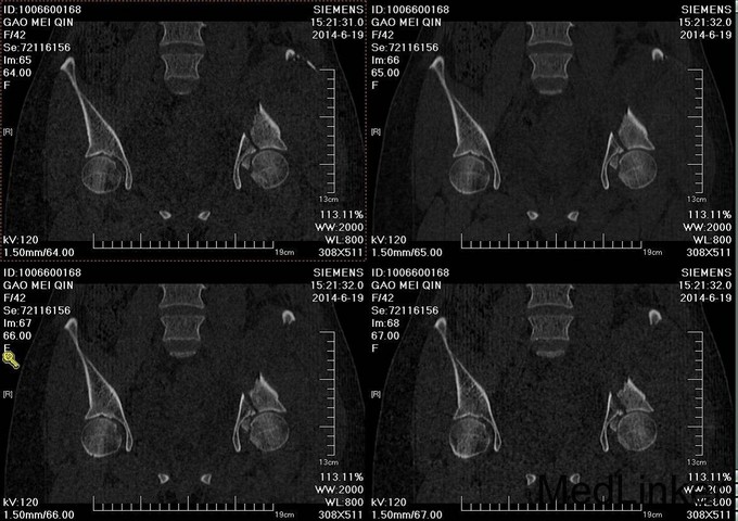 主诉:车祸外伤后左髋部疼痛伴活动受限4天 患者于2014年6月12日早6点左右被皮卡车撞伤,伤后患者出现一过性昏迷,被急诊送往当地医院,行DR及CT检查后,诊断为:左髋臼骨折,于当地医院骨科行骨牵引、抗炎补液等对症治疗后,现为求进一步治疗转入我科,患者病来无头晕头痛,无恶心呕吐,已排气排便.