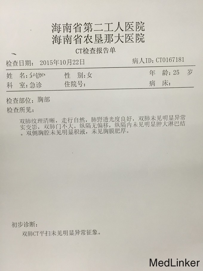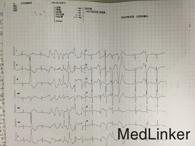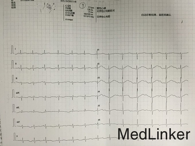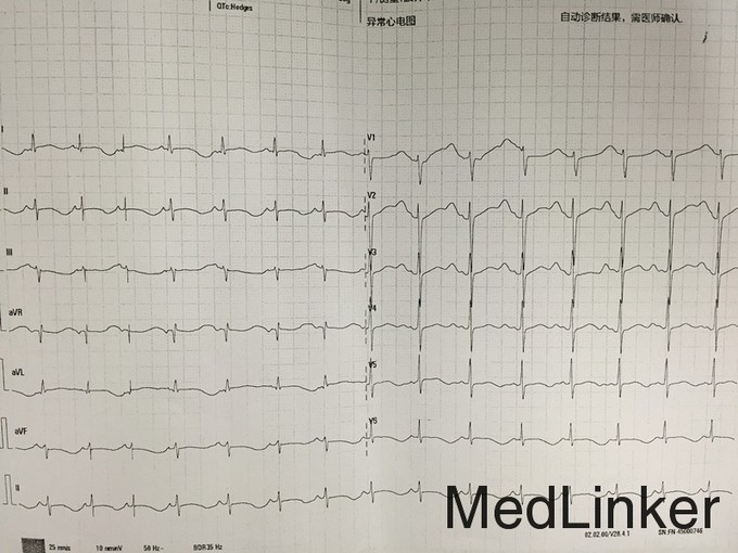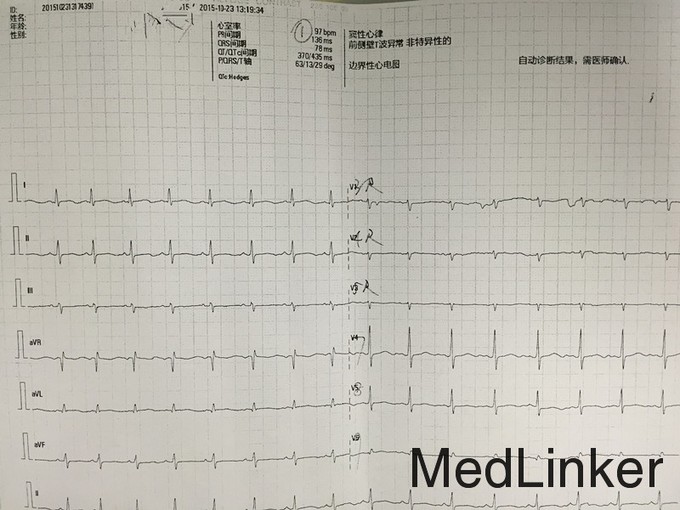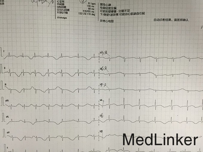 T:37.1℃ P:68次/分 R:20次/分 BP:88/51mmHg 发育正常,营养中等,神志清楚,精神可,步入病房,表情自然,言语清晰、流利,自主体位,正常步态,查体合作。全身皮肤及黏膜未见皮疹。无皮下出血。皮温正常,弹性正常,双下肢无水肿,未见肝掌及蜘蛛痣。全身皮肤及黏膜无紫绀、黄染、苍白,全身浅表淋巴结未触及肿大。头颅无畸形,眼睑无水肿及下垂,闭合有力,眼球无凸出及凹陷,睑结膜无出血、水肿,巩膜无黄染,双侧瞳孔等大等圆,直径2mm,对光反射及调节反射均灵敏,耳廓未见畸形,鼻无畸形,鼻腔通畅,无分泌物,口唇红润,伸舌居中,口腔黏膜光滑,无皮疹、无溃疡,双侧扁桃体无肿大,咽无充血,喉发音正常。颈软,无抵抗感。双侧颈动脉无异常搏动,颈静脉无怒张,气管居中,甲状腺不肿大,未闻及血管杂音。胸廓无畸形,左右对称。双侧呼吸运动度一致,吸气时无肋间隙、胸骨上窝及锁骨上窝凹陷,胸骨及肋骨无明显叩击痛。双侧呼吸运动对称,呼吸节律规则,肋间隙无明显增宽或狭窄,触诊双侧语颤一致。双肺叩诊呈清音。双肺上下界无异常,听诊双肺呼吸音清,双肺未闻及干湿性罗音。未触及胸膜摩擦感,语音传导未及明显异常。心前区无隆起,心尖搏动位于第5肋间左锁骨中线内0.5cm,搏动范围正常,心前区未触及震颤,叩诊心界不大,听诊心率:68次/分,律齐,各瓣膜听诊区未闻及心包摩擦音。腹部平坦,未见胃肠型及蠕动波,未见腹部静脉曲张。腹部平软,无压痛及反跳痛,无液波感及震水声。未触及腹部肿块。肝肋下未触及,无叩击痛。胆囊未触及,Murphy征阴性,脾脏肋下未触及,无叩击痛,肾脏未触及,无输尿管压痛点,肝浊音界存在,肝上界位于右锁骨中线第5肋间。肝肾区无明显叩击痛,移动性浊音阴性。肠鸣音正常,4次/分,未闻及血管杂音。肛门及外生殖器未查。脊柱生理弯曲存在,各椎体及脊肋角无压痛及叩击痛,活动自如,四肢无畸形。四肢活动自如,无杵状指、趾,双下肢无水肿。生理反射正常,病理反射未引出。 入院心电图:窦性心律,心率:65次/分,Ⅰ、Ⅱ、aVF、V3、v4、v6T波异常,QT 509ms。血常规:白细胞WBC 5.51x10^9/L ,中性分叶粒细胞NEUT% 0.600 ,血红蛋白Hb 120g/L ,血小板PLT 342x10^9/L↑;急诊生化组合:钾K 3.98mmol/L ,肌酐CREA 54umol/L ,白蛋白ALB 39g/L ,丙氨酸氨基转移酶ALT 16U/L ,天冬氨酸氨基转移酶AST 17U/L ;大便常规+隐血试验(OB):转铁蛋白 弱阳性( +/- ) #;尿常规分析:尿粒细胞酯酶(干化学) 阳性( 4+ ) ,尿蛋白(干化学) 弱阳性( +/- ) ,白细胞 (WBC)(镜检) 阳性( 2+ ) ,颗粒管型(镜检) 阳性( 1+ ) ;术前筛查组合1:乙肝核心抗体(发光)HBcAb 9.01S/CO↑。游离甲功、出凝血常规、心梗组合、PCT未见明显异常。血脂组合:总胆固醇CHOL 4.0mmol/L,甘油三脂TG 1.63mmol/L,高密度胆固醇HDL-c 0.93mmol/L↓,低密度胆固醇LDL-c 2.30mmol/L。
