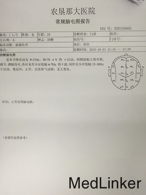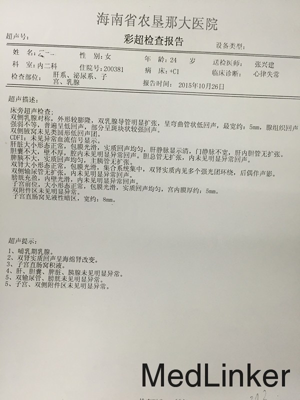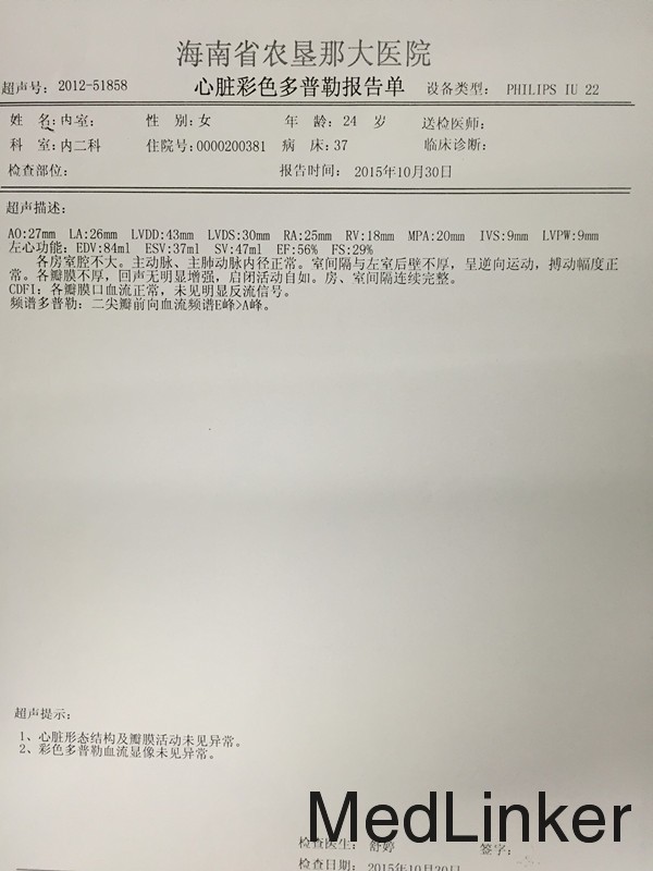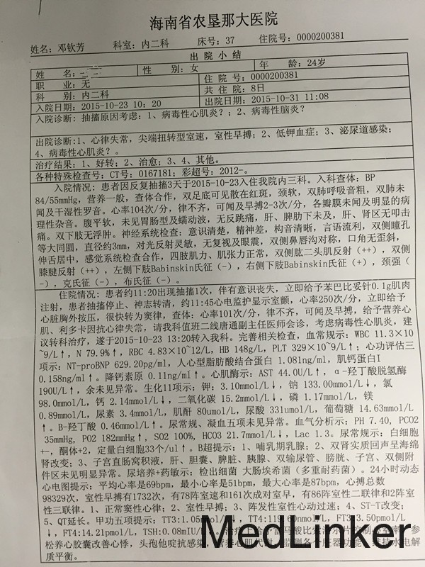 女,24岁,反复抽搐、晕厥半月。 患者10-18日无明显诱因出现发热,最高体温达39.8℃,伴有腹泻2次,为水样便,伴有腰部胀痛,无尿频、尿急、尿痛,至当地医院就诊,考虑“扁桃体炎”、“乳腺炎”,予”贝洛芬、炎琥宁、头孢克肟”等药物治疗2天。19日患者四肢出现红色斑丘疹,边界清楚,大小约1.5*1.5cm,表面未见脓液,有触痛,予“炉甘石洗剂”对症处理,皮疹无明显消退。20日患者无明显诱因下出现头晕、全身麻木、胸闷、气促、呼吸困难,随之晕倒,并出现四肢抽搐,伴面部紫绀、四肢发凉、眼球上翻,不伴有口吐白沫,家人呼之不应,约持续1.5min,自行苏醒。22日至海南省农垦那大医院就诊,就诊过程中再次发作上述症状,考虑“癔症”,未予特殊处理,返家后再次发作两次,且发作时间延长至2.5min。再次至当地医院就诊,收住入院。住院期间再次发作抽搐,立即给予“苯巴比妥0.1g肌肉注射”,患者抽搐停止,神志转清,心电监护提示室颤,心率250次/分,予心脏按压,转为窦律,予“利多卡因、营养心肌”等治疗,外院考虑“病毒性心肌炎”,查血常规示白细胞11.3*10^9/L、中性粒细胞百分百0.799、血红蛋白148g/l、血小板329*10^9/L;生化示:肌酐80umol/l、AST44u/l;心脏相关生物标记物示:NT-proBNP629.2pg/ml、TnI0.158ng/ml、PCT0.11ng/ml/;尿培养示:检出大肠埃希菌;甲功:TT3 1.05nmol/l、TT4 119.6nmol/l、FT3 3.5pmol/l、FT4 14.21pmol/l、TSH0.08mIU/l;24小时动态心电图示:正常窦性心律、室性早搏、阵发性室性心动过速、ST-T改变、QT延长;脑电图示:正常脑电图;B超示:双肾实质回声呈海绵肾改变,。出院后予比索洛尔、头孢他啶等治疗后患者症状有所缓解。现为进一步治疗收入我科。起病以来,无咳嗽、咳痰,无恶心、呕吐,无双下肢水肿,精神、睡眠尚可,胃纳一般,二便正常。体重无明显减轻。 既往史、个人史、月经婚育史、家族史无特殊。