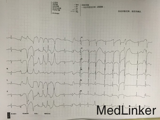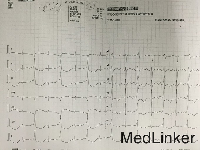 讨论:该患者为肾上腺素能依赖性尖端扭转性室速和长QT综合征可能性大,治疗以减低交感神经张力为主,常用β受体阻滞剂如普萘洛尔作为首先治疗,其用量根据疗效逐步增加,最多可达100~150mg/d。β阻滞剂可使心率减慢,QT间期因此延长,但QTc可能缩短。治疗效果以长期随访不再有晕厥发作来衡量,而QT间期可能并不明显缩短。交感神经阻滞药如胍乙啶、利血平等也可应用。药物治疗效果不满意时可作左颈胸交感神经节切除术。