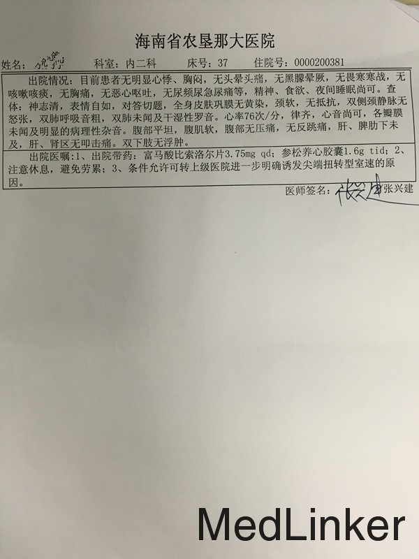 1.心脏性晕厥 1)尖端扭转性室速 2)心室颤动 2.长QT综合征 1)获得性:病毒性心肌炎? 2)遗传性待排 考虑:患者外院反复发作抽搐、晕厥5次,曾有高热、心肌酶轻度改变,发作期间心电监护曾示室颤,24小时心电图示室速,外院考虑“尖端扭转性室速、病毒性心肌炎?”,入院心电图示:QTC509ms,患者7个月前心电图未见QT间期长,考虑患者“尖端扭转性室速,长QT综合征(获得性可能性大),病毒性心肌炎?”。 治疗上予非选择性beta受体阻滞剂治疗,同时予潘南金、万爽力、能气朗、磷酸肌酸营养心肌。该患者诊断未完全明确,建议植入ICD,但由于经济问题,患者表示拒绝检查和手术治疗,自动出院。