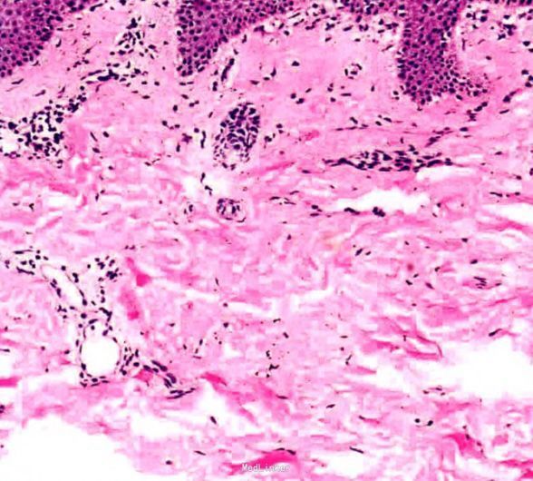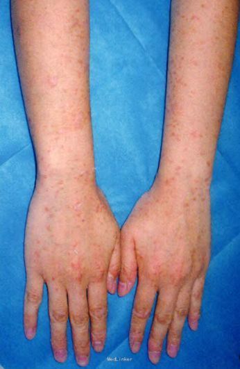 皮肤科检查:躯干及四肢泛发大量粟米至绿豆大红色斑、丘疹,界清,表面覆少许细小鳞屑,点状出血现象阴性。皮损组织病理检查:表皮轻度角化过度伴灶性角化不全,棘层局部海绵形成;真皮浅层血管周围少许慢性炎性细胞浸润。
