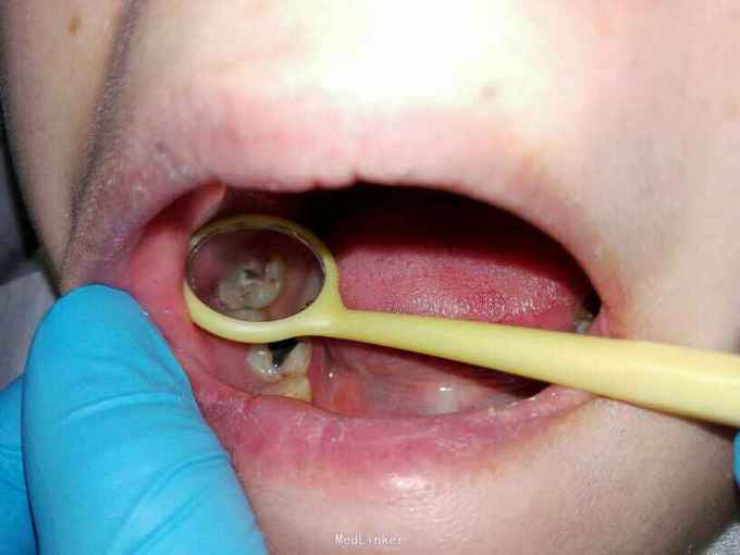 检查:17远中牙冠大面积缺损,进髓,探-,冷诊不适,叩+,无明显松动,牙龈未见明显异常 x线:17远中牙冠大面积低密度透射影,进髓,牙周膜宽度基本正常,根尖未见明显异常