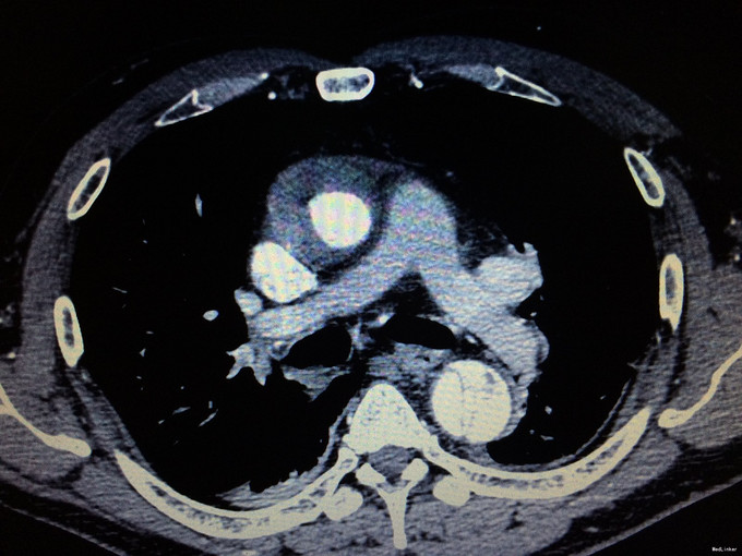 CT:升主动脉环形增厚,未见强化;主动脉弓和降主动脉形成动脉夹层,可见内膜片