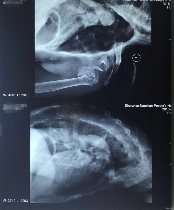 患者,女性,95岁,因“摔伤致左肩部疼痛、肿胀、活动困难4小时”入院。 患者缘于入院前4小时前因不慎摔伤致左肩部受伤,即觉左肩部疼痛、活动困难、肿胀,由家属送往我院就诊,经行X射线提示“左肱骨近端粉碎性骨折”,急诊科未予特殊处理,为做进一步诊治而收入院。患者受伤以来,精神好,无呼吸困难,无恶心、呕吐,无头晕,无大小便失禁史。