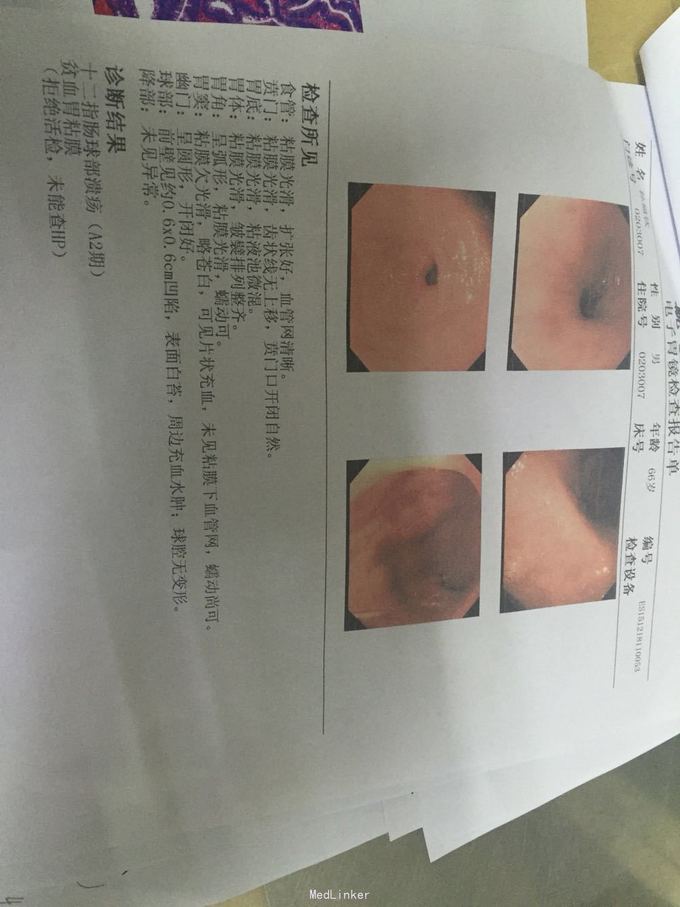 轻度贫血貌,腹部平软,肝脾未触及,无压痛及反跳痛。化验传染病四项阴性,血常规HGB99g/L,生化、凝血、肿标均未见异常。腹部彩超未见异常,胃镜提示十二指肠球部溃疡(A2)C13呼气提示HP阳性。