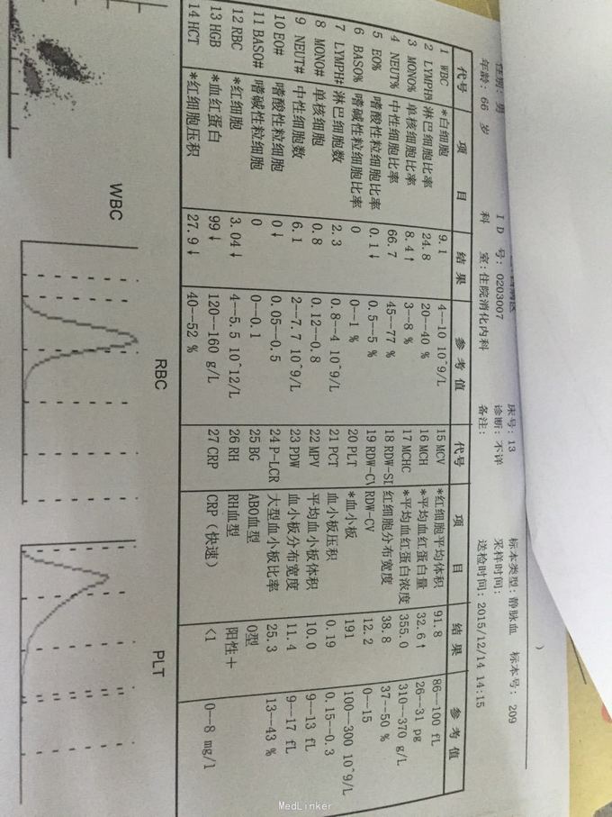患者,男,66岁,糖尿病史7年,冠心病2年,2月前放置冠脉支架,术后规律口服肠溶阿司匹林及波利维抗血小板聚集,因黑便两天入院。共柏油样便2次,每次约200g ,伴头晕心悸,乏力,无呕血。