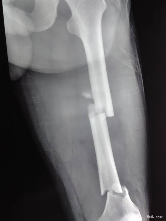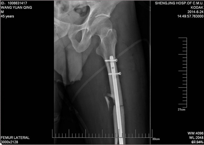 患者自诉于2014-6-1中午骑摩托车被汽车撞翻,伤后昏迷,被肇事司机寄送到当地医院,拍片检查,诊断为:颅脑损伤,脾破裂,左股骨骨折,左胫骨平台骨折。给予保守治疗,并转往盖州市中心医院,急诊下行脾切除术,右下肢给予石膏固定,待患者病情稳定后建议转往上级医院。现患者为求进一步诊治来我院就诊,以“左股骨骨折,左胫骨平台骨折,颅脑损伤,脾切除术后”为主要诊断收入我科。患者伤来无恶心呕吐,腹痛腹胀,胸闷心悸等特殊不适,饮食差、睡眠可,小便可,未大便,体重无明显变化。