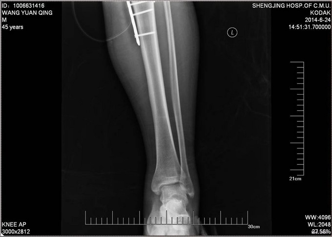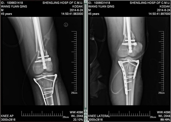 诊断:左股骨骨折,左胫骨平台骨折 双侧胸腔积液 脑出血 脾切除术后 患者入院后见患肢肿胀明显,给予患肢抬高位,冷敷,甘露醇消肿等对症治疗,带患肢出现褶皱试验阳性后,全麻下行右股骨干骨折闭合复位髓内针固定术;左胫骨平台骨折切口复位钢板内固定术,术后患者肿胀明显,给予抗炎,消肿,冷敷,患肢抬高等对症治疗。患者每天换药观察切口愈合情况,无红肿及渗出,待伤口14天后予以拆线治疗,予以出院,给予康复处方。