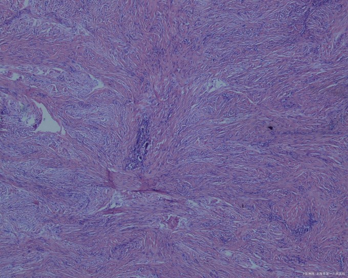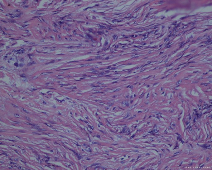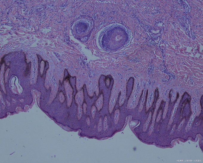 皮损组织病理检查显示结节位于真皮内,无包膜,境界不清,与周围正常组织有明显的交错,下界清楚,上界与表皮之间常夹着一条“境界带”,但瘤组织有时也可与表皮相连。病变组织由成束的成纤维细胞、组织细胞和成熟或幼稚的胶原纤维组织组成,相互交织;病变上方的表皮明显增生,棘层肥厚,皮突延长。偶见有核丝分裂象。