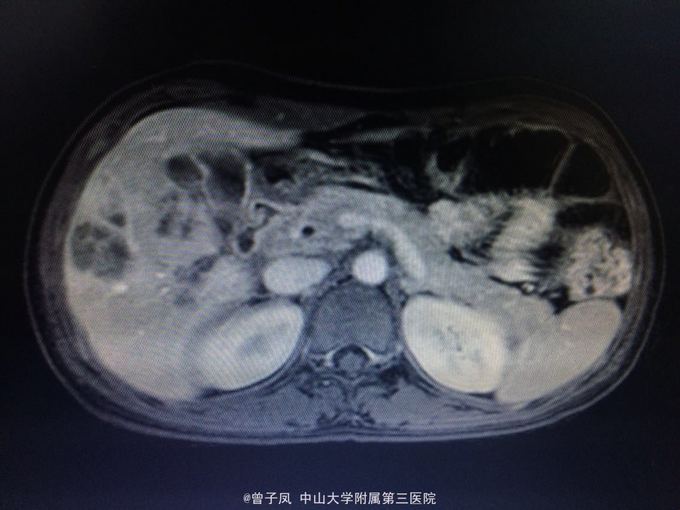 26岁女性,既往体健。近2年参与生猪肉加工。 右上腹痛1月余。 伴厌油、腹胀,偶有恶心、呕吐,无发热、畏寒、咳嗽、咳痰,至外院查EOS%51.84,上腹MR示肝右叶多发占位病变,考虑肝脓肿可能。肝穿病理示考虑寄生虫感染,予头孢哌酮他唑巴坦、奥硝唑、阿苯达唑治疗,腹痛稍缓解,为进一步治疗入院。