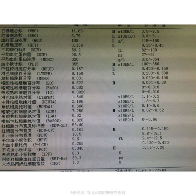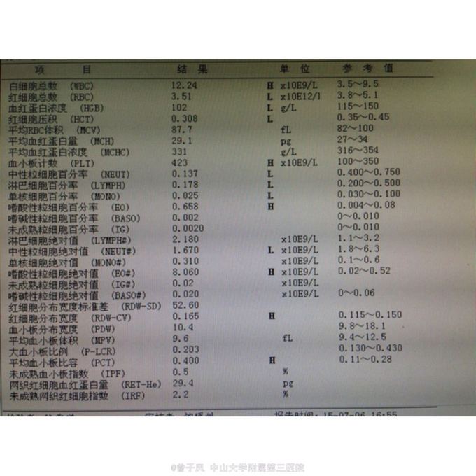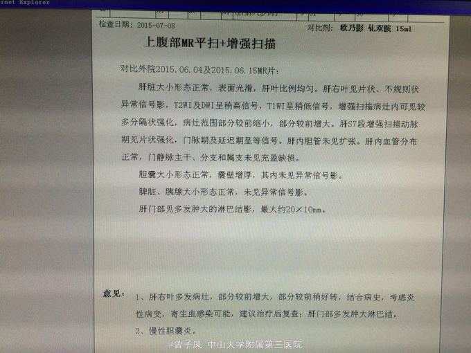 肝占位病变:寄生虫感染:蠕虫蚴移行症? 予吡喹酮0.8g tid 诊断性治疗10天,复查血常规示嗜酸性粒有下降,患者腹痛缓解。