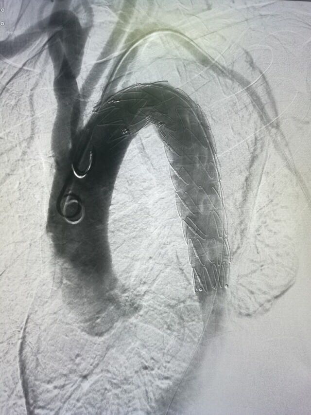 VAMF3030C200TE 覆膜支架封闭主动脉夹层破口,且主动脉弓上动脉血流不受影响。