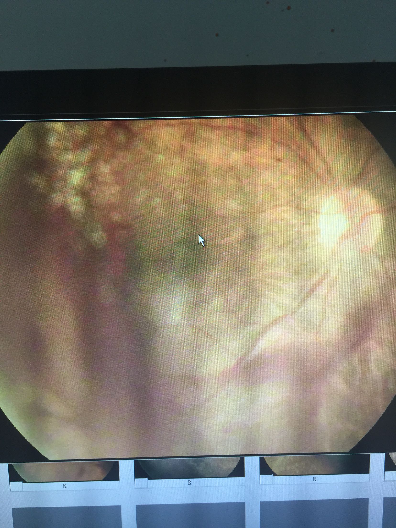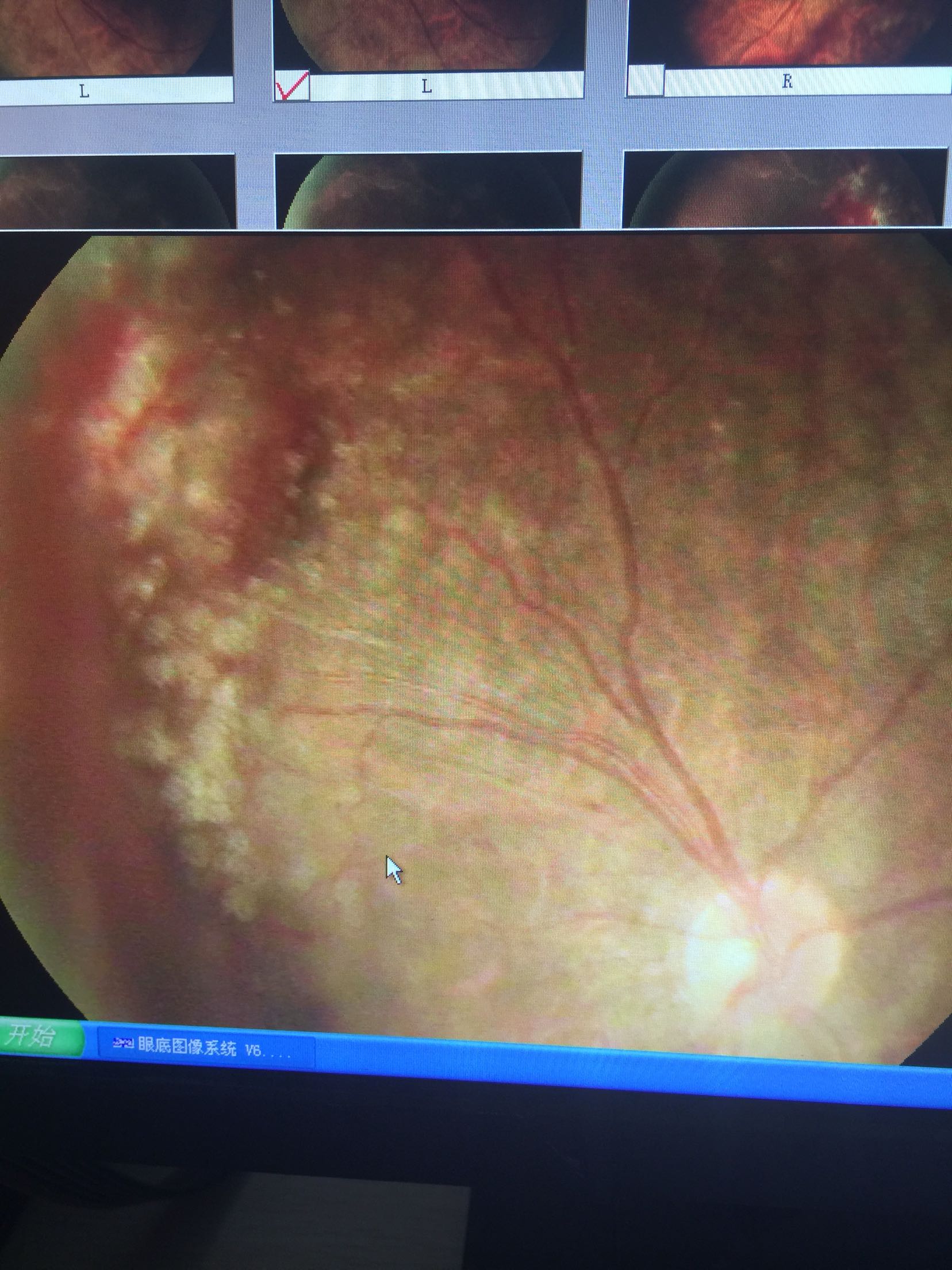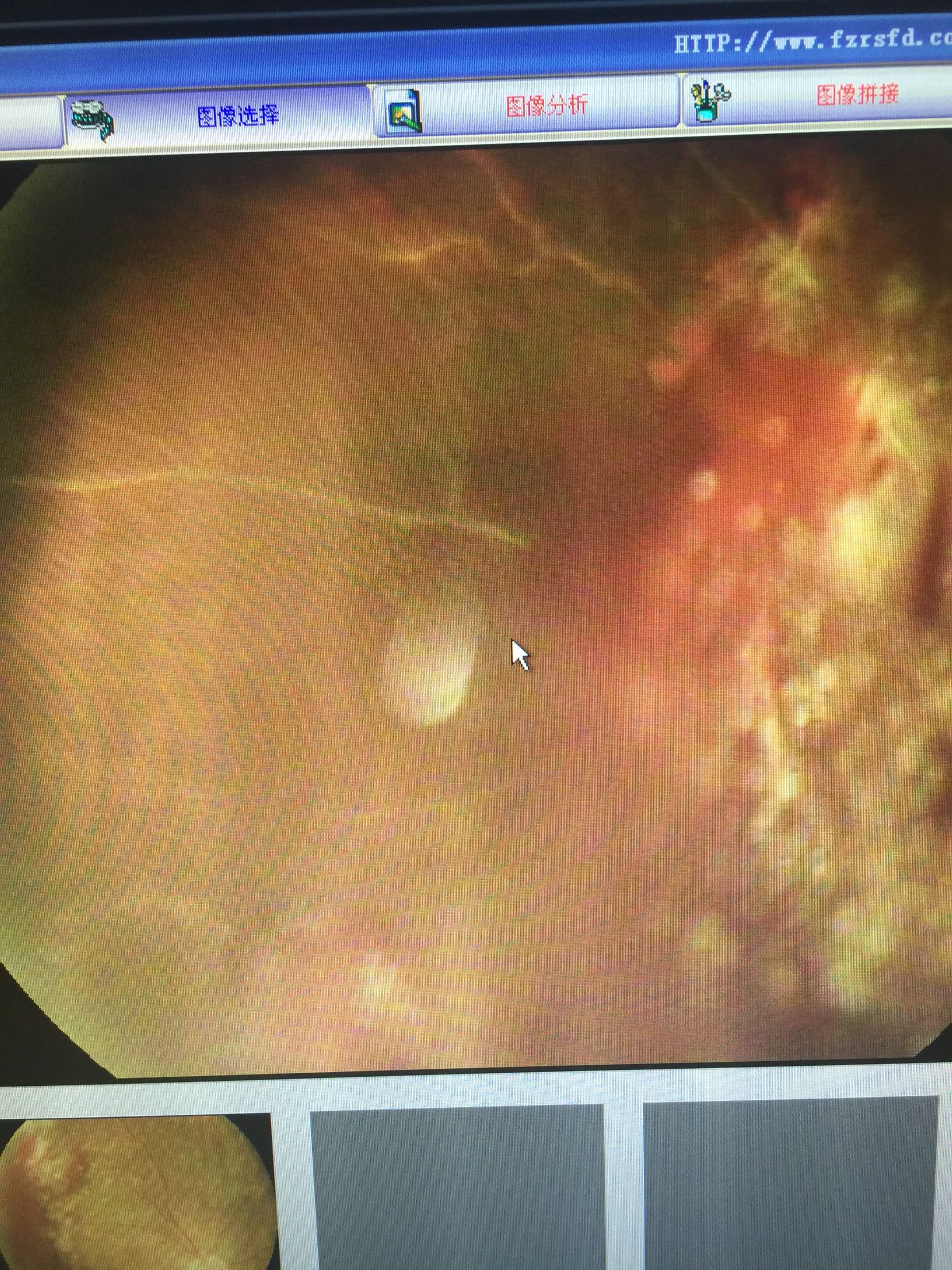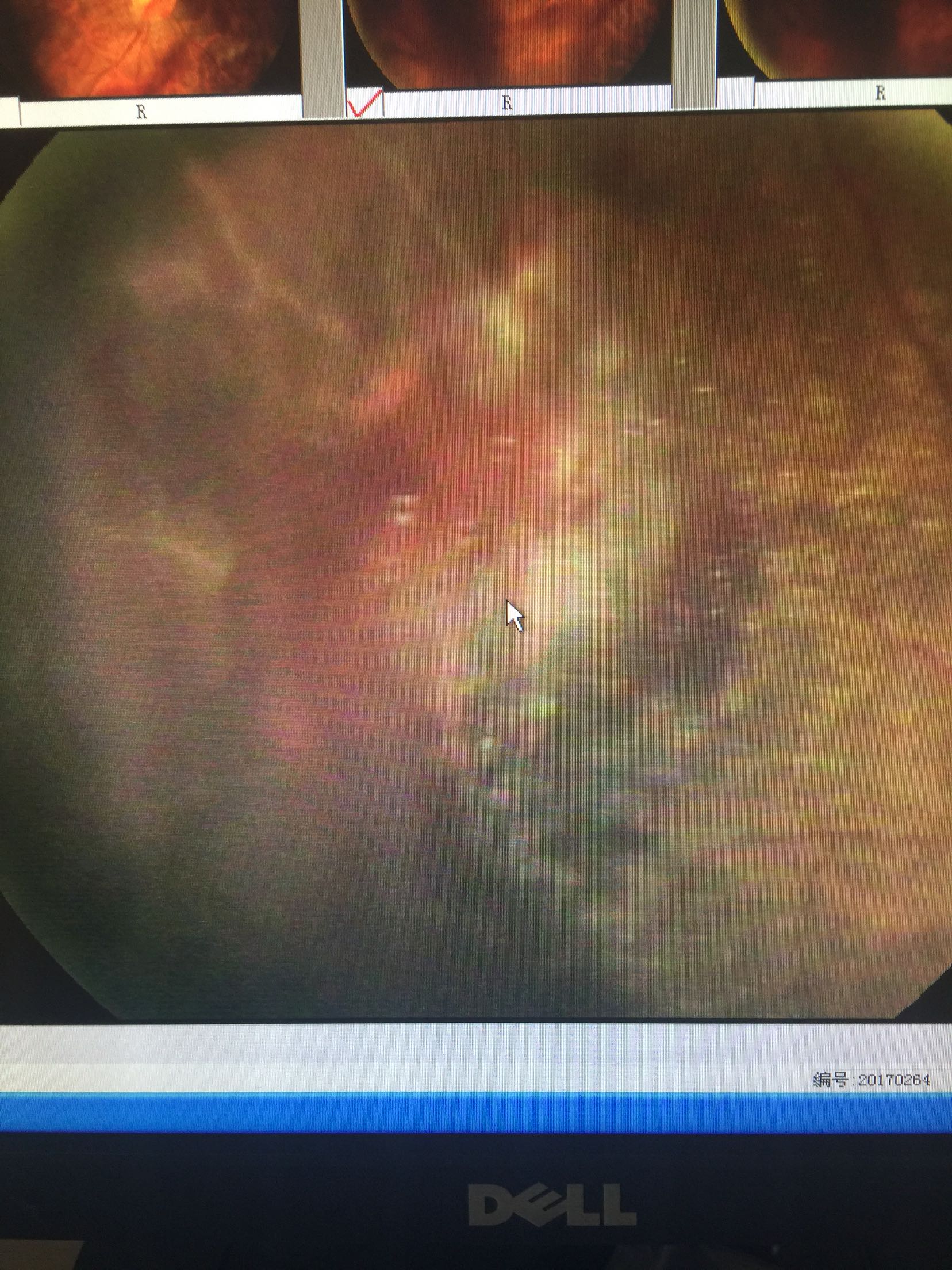 右眼:0.8 左眼:0.5 右眼睑无水肿,结膜无充血,角膜透明,前方中深,晶体呈黄白色混浊,虹膜纹理清,下方玻璃体见数片积血,眼底视盘界清色可,黄斑中心凹可见,颞侧见倆处灰白色增殖膜,上有暗红色出血,颞上血管迂曲,周边呈白线状,颞下及下方见暗红色积血 眼压:11/10 B超:双眼玻璃体星状变性 空腹血糖:5.6 OCT:双眼黄斑区各层次结构可,右眼黄斑区颞侧神经上皮层表面见一弧形隆起反射光带 造影:右眼动静脉充盈时间明显延迟,右眼颞上象限早期见荧光渗漏明显增强,颞上象限周边大面积无灌注