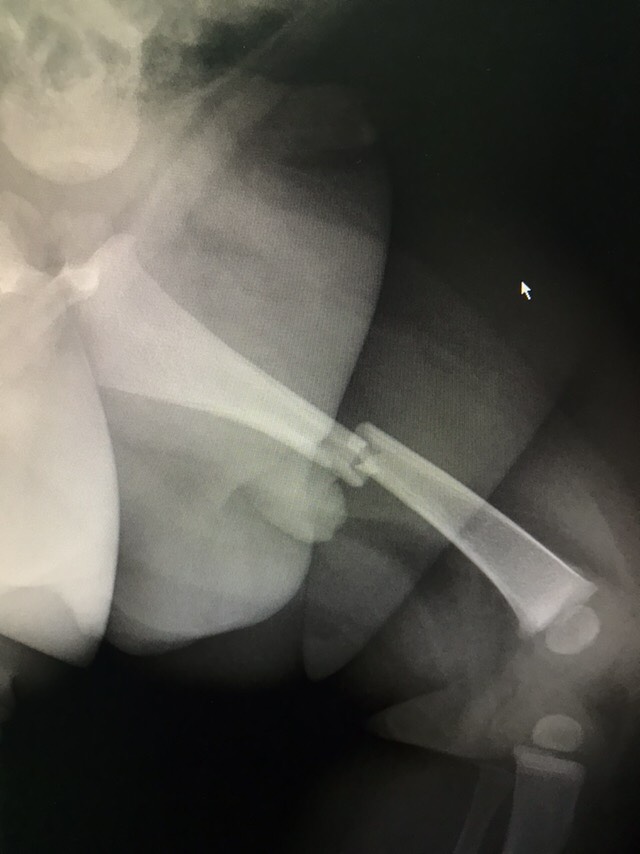患者男性,6月。主诉:左腿疼痛、活动受限20小时。现病史:20小时前患者摔伤后左腿疼痛,拒按,形态异常,伴有活动受限,患儿反复哭闹不安,急诊于当地医院行x光检查提示:左腿股骨中段骨折,断端分离。现为进一步治疗,急诊以“左股骨中段骨折”收入我科。自患病以来,患者精神、食欲、睡眠一般,大小便基本正常,体重无明显变化。既往史无特殊。