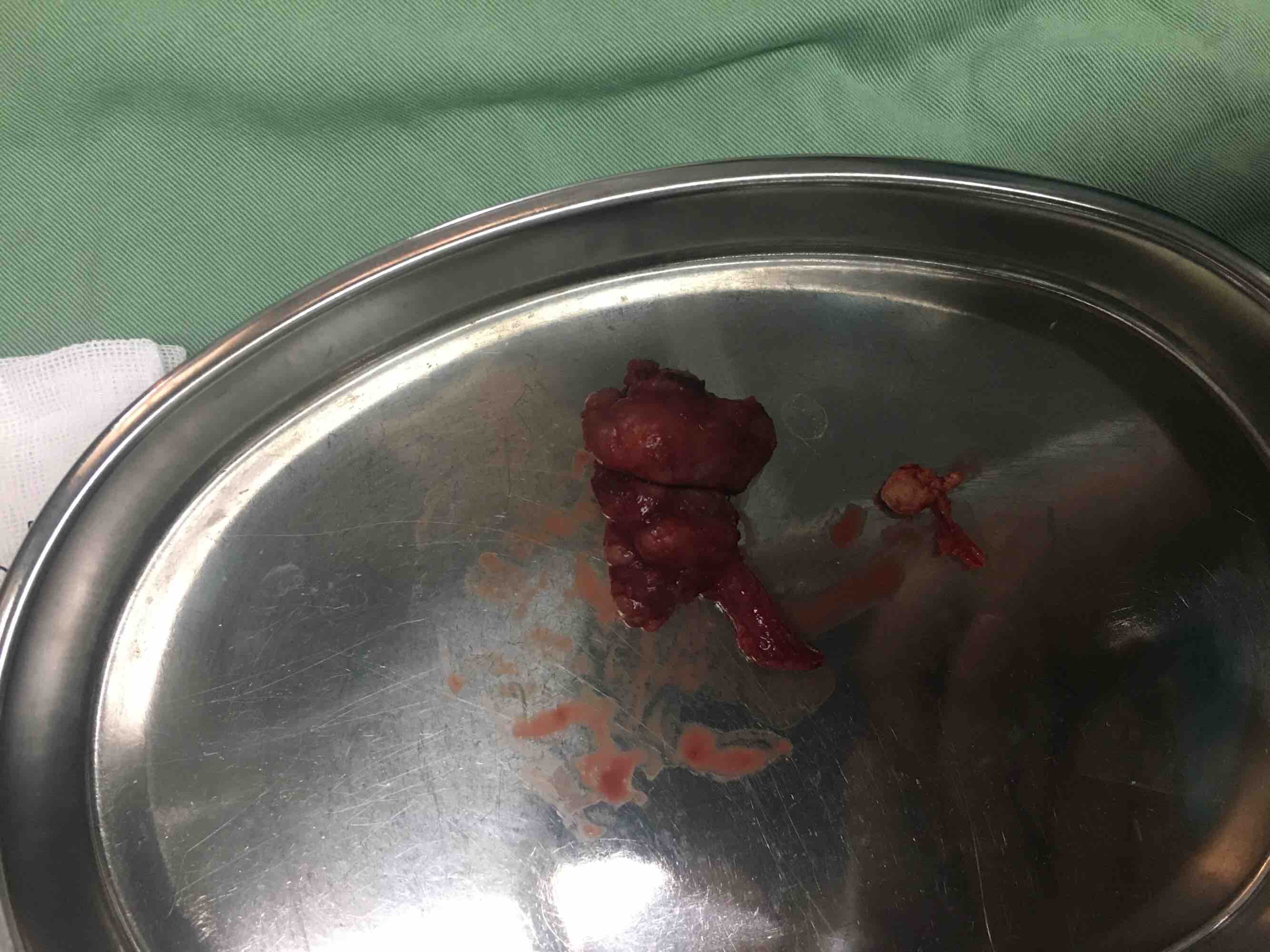 随访:7日拆线,口角无偏斜,舌体无麻木。讨论:涎石病致慢性颌下腺炎反复发作,致腺体纤维化,需手术切除颌下腺,同时需取出涎石,一般情况下,涎石如位于第二磨牙之前可口内取出涎石,位于腺体内或近腺体端涎石口内难以取出需要切除腺体同时取出涎石,术中注意保护面神经下颌缘支,舌神经,颌外动脉近心端