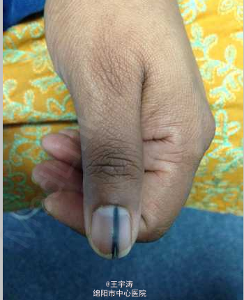 中年妇女,大拇指甲下黑线,6个月,因其他原因偶然被发现,初步怀疑是黑素瘤,有其他的吗?