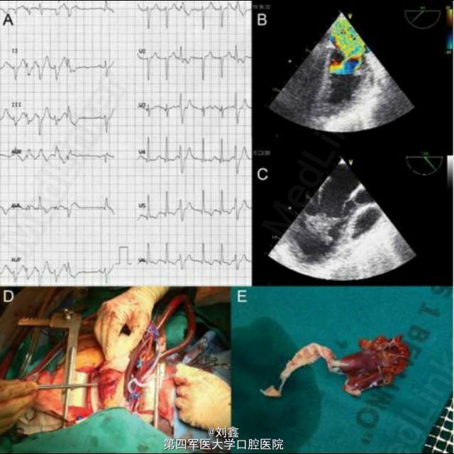 患者男,27,车祸致多发伤入院。心电图检查:阵发性心动过速,二尖瓣返流。术中可见:心室壁撕裂,二尖瓣暴露后,可见完整撕裂的前外侧乳头肌和部分邻近心肌。 胸部钝挫伤后乳头肌外伤性破裂很罕见,值得学习。