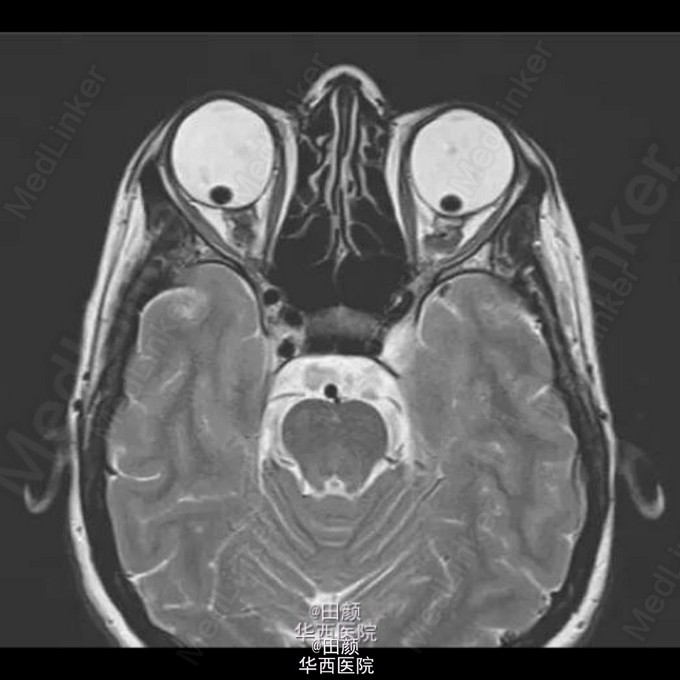 患者女,31岁,出现双眼视力渐进性下降3月,轻度感音神经性耳聋2周,马凡综合征病史。眼科检查:双眼视力OD:0.25,OS:0.05,双眼眼压正常,散瞳后裂隙灯检查检查发现双眼晶状体脱位入玻璃体腔,眼底检查发现存在视网膜变性,但未见视网膜撕裂及视网膜脱离的迹象。由于患者出现无法解释的听力下降而予以头颅MRI扫描,检查结果如下。