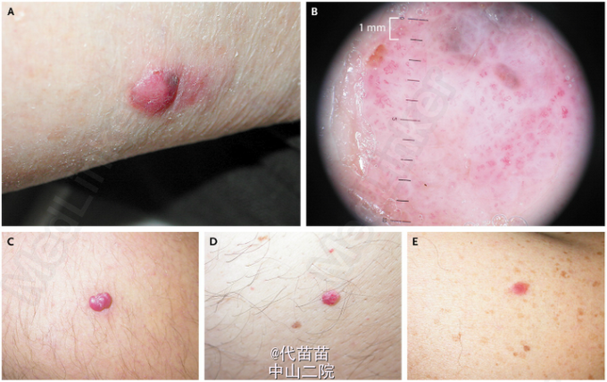 48岁女,左前臂红色结节肿大2年,合并蓝灰色色素浸润区.皮肤镜如图B所示,考虑黑素细胞痣.随后的病理学检查证实无黑素性黑素瘤,Breslow厚度3.9 mm.切除后发现前哨淋巴结,行腋下淋巴结清扫和辅助化疗.无黑素性黑素瘤常被误诊,怀疑癌变的结节建议进行病理学检查