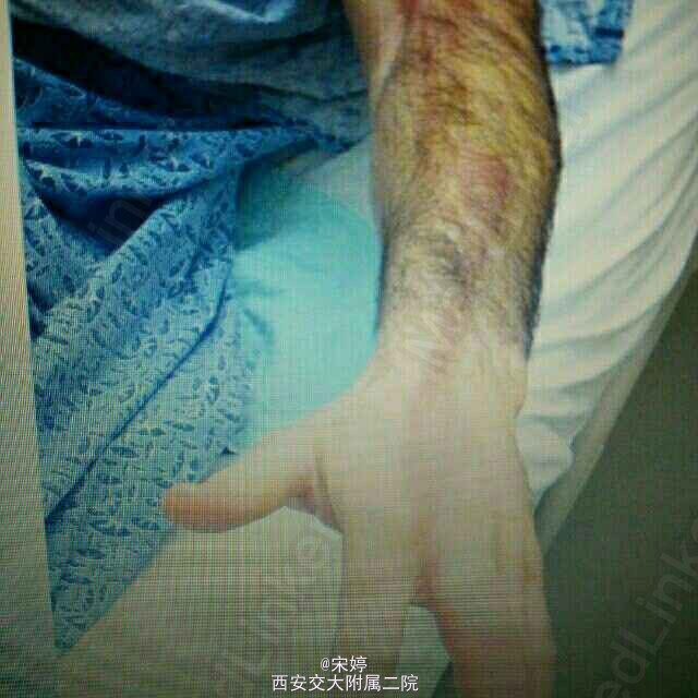 患者,男,20岁。因迅速进展的左臂疼痛急诊入院。患者在参加运动比赛时左手中指受伤,此前均未觉异常。当晚,患者手指疼痛难忍,同时出现像手腕蔓延的红斑,因此就诊。