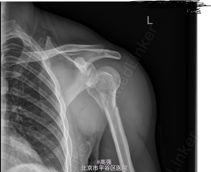 男,39岁。外伤致左肩部肿痛伴活动受限2小时。 患者于2小时前不慎外伤后,当即致左肩部剧烈疼痛,左肩关节活动受限,不能抬举,逐渐肿胀,无恶心呕吐,无其他肢体疼痛不适等,予拍片示“左肱骨近端粉碎性骨折”,为求进一步治疗,来我院就诊,予行X检查后示“左肱骨近端粉碎性骨折”,拟“左肱骨近端骨折”收住入院。