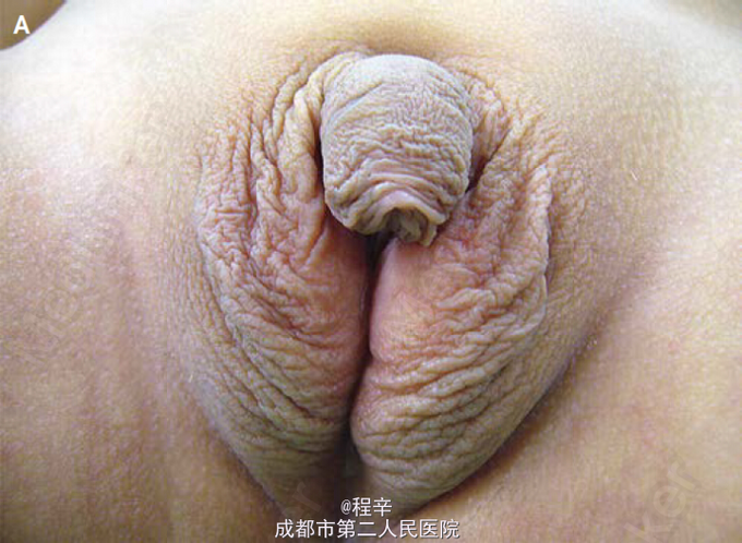 诊断:女婴21-羟化酶缺乏性先天性肾上腺皮质增生症(失盐型)。生殖器假两性畸形特征性表现为泌尿生殖窦及阴蒂阴唇肥大,这类似于男性隐睾患者的尿道下裂。 处理:纠正电解质异常、系统应用糖皮质激素以及盐皮质激素替代治疗。在患儿2岁时予复杂的重建手术,包括泌尿生殖窦的修复(下图,黑箭头)、阴蒂成形术(箭头)和阴道成形术(白箭头)。