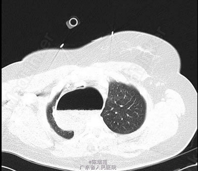体检发现,患者呼吸急促,但无明显哮鸣音。急救人员初步考虑为哮喘急性加重,给予激素雾化吸入和静脉使用,但症状无好转。 急诊行胸片示右上肺透亮影(图 1)。 行肺部 CT 示食管内有大量食物,呈显著扩张状态;严重压迫气管及气管内插管(图 2)。拔管后行胃十二指肠镜检查,未发现存在梗阻。