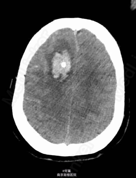 查体:BP:158/103mmHg,余生命体征平稳。专科查体:嗜睡状,呼之能应,查体欠合作;右侧额部留置有脑室外引流管,引出淡红色脑脊液;颈项强直。 辅助检查:CTA:蛛网膜下腔出血,脑室积血,右侧额叶血肿伴灶周水肿,脑实质明显肿胀,中线局部左移,右侧脑室见引流管。基底动脉瘤,其内密度不均匀,可疑血栓形成,大小约1.0x1.5cm;左侧椎动脉颅内段动脉瘤,大小约0.6x0.5cm;左侧大脑中动脉M1及M2D段交界区动脉瘤,截面大小约0.6*0.6厘米;右侧颈内动脉终段、左侧大脑中动脉M1段及椎动脉管腔不均匀,局部增粗,管壁欠光整。