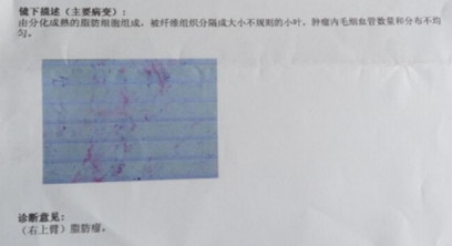 讨论:脂肪瘤是由成熟脂肪细胞所构成的一种常见表浅良性肿瘤,表现为单个和多个皮下局限性肿块,或与血管球瘤并存,除肿瘤较大影响局部动作,或因压迫神经而引起疼痛外,一般无自觉症状。极少恶变。好发于颈、肩、背和腹部,亦可见于腹膜后和内脏。最常见于头、颈、臂和胸等部位皮下组织。约有7%皮损呈多发,多发皮损发育早,单发损害发育迟,到一定程度时即停止生长。较小脂肪瘤,发展缓慢,无临床症状者一般无需处理。如果长得很大、感觉疼痛或影响美观时,可考虑手术切除。激光手术治疗脂肪瘤有多种方法,但对小的脂肪瘤采用微切口激光切除分叶取出。较大脂肪瘤根据部位按外科要求选择切口摘除。