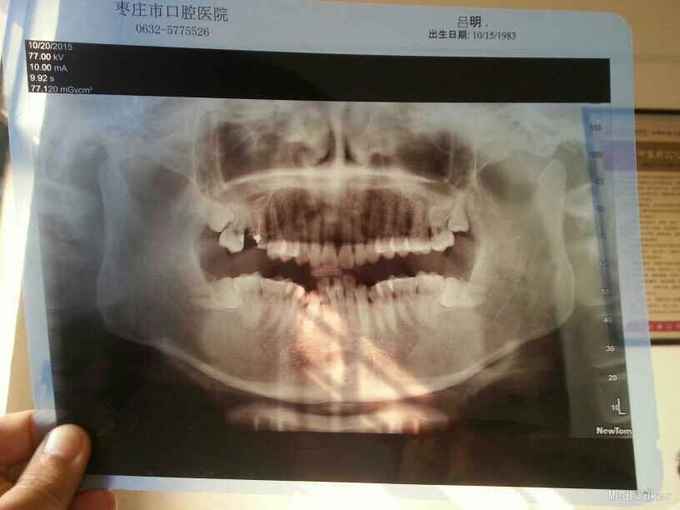 男 32岁 右上六深龋,根管治疗后行烤瓷牙修复,一月后塞牙严重,烤瓷牙去除后,行曲面断层拍摄,影像显示右上六远中大面积缺损,右上七远中倾斜,右上八阻生