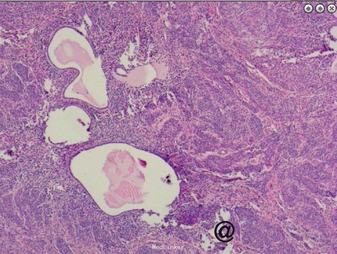 阑尾癌比较少见,以类癌多见,约占90%以上,腺癌罕见。类癌是胃肠道恶性肿瘤的一种,瘤体小,生长也慢,症状常不明显,亦可发生转移。类癌并不多见。如果类癌瘤体分泌释放肽胺类激素,患者就会出现腹痛、腹泻、哮喘、肝肿大等症状,医学上称为类癌综合征。阑尾炎很少发生此征。类癌各个年龄均可发病,平均发病年龄为40岁。阑尾类癌的恶性程度低,瘤体小,直径多在2厘米以下,且极少发生转移。阑尾类癌大多生长在距阑尾顶端1/3处,故不易堵塞阑尾管腔,很少引发阑尾炎。如果类癌生长在阑尾中1/3处,则多因堵塞管腔而发生阑尾炎。手术中,由于瘤体小,易不发现或误认为粪石,病理检查后方能得出正确诊断。阑尾类癌还可有阑尾穿孔表现,一般手术后才发现是阑尾类癌穿孔。本例发现腺癌,中分化程度,经切除后患者恢复良好,查国内文献偶尔有粘液性阑尾癌患者报道。本例手术前曾行肠镜检查观察阑尾内口无明显异常,分析考虑患者病变靠近阑尾顶端可能。所切除大体标本阑尾外膜尚完整光滑,咨询病例科医生诉患者阑尾肌肉组织层含有很多纤维增生成分。国外文献有报告甚少,多以类癌报道为主,近期看见一篇阑尾印戒细胞癌的case report!(Primary signet ring cell carcinoma of the appendix: A rare case report. World J Clin Cases 2015年 3卷 6期 538-41页 Primary adenocarcinoma of the appendix is a rare malignancythat constitutes < 0.5% of all gastrointestinalneoplasms. Moreover, primary signet ring cell carcinomaof the appendix is an exceedingly rare entity. In the present report, we describe a rare case of primary signet ring cell carcinoma of the appendix with ovarian metastasesand unresectable peritoneal dissemination occurring in a 45-year-old female patient. She was clinically misdiagnosed as torsion of ovarian cyst. She underwent appendicectomy and unilateral salpingo-oophorectomy.Histopathology revealed signet ring cell carcinoma and a right hemicolectomy was done. She then received palliative systemic chemotherapy with 12 cycles of oxaliplatin, 5-fluorouracil, and leucovorin (FOLFOX-4). The patient is doing well till today on follow up without progression of disease 10 mo after beginning chemotherapy. )